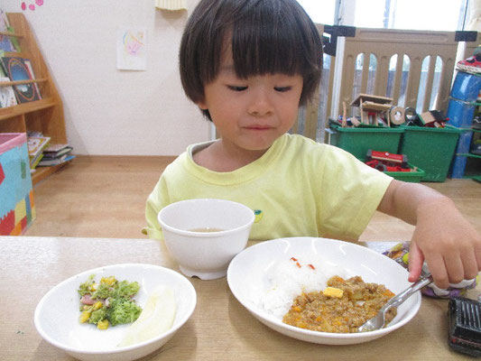 お昼ごはんは、お月見ドライカレー・ブロッコリーとベーコンのソテー・きのこのスープ・りんご。おやつは、スイートポテトです。