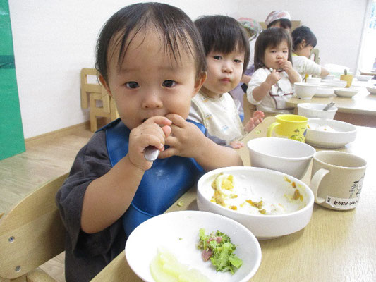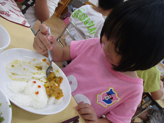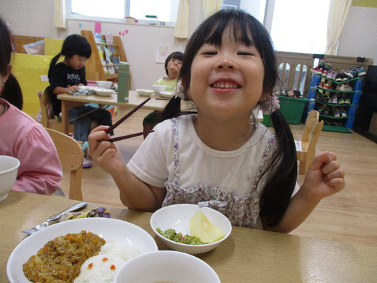 「どこから食べようかな~」「うさぎさんにカレーのお布団かけてあげる!」とうさぎさんの給食にとっても喜んでいる様子でした。